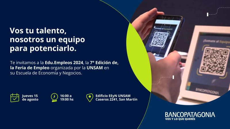 En Banco Patagonia buscan sumar talentos y estarán presentes en Edu.Empleos 2024, la 7° Edición de la Feria de Empleo de la Universidad Nacional de San Martín.