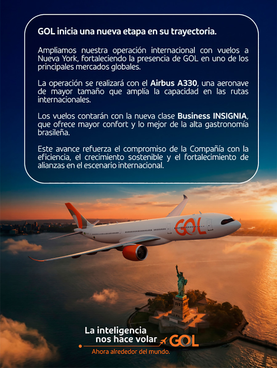 Gol amplia nueva operación internacional con vuelos a Nueva York, fortaleciendo la presencia de Gol en uno de los principales mercados globales.